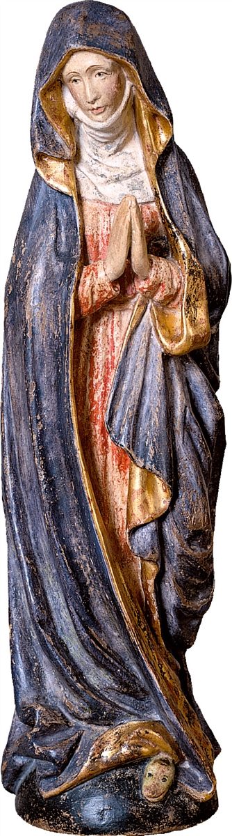Auf Kreidegrund mit Temperafarben bemalt, antikisiert und auf Poliment mit 23 Karat Blattgold veredelt.